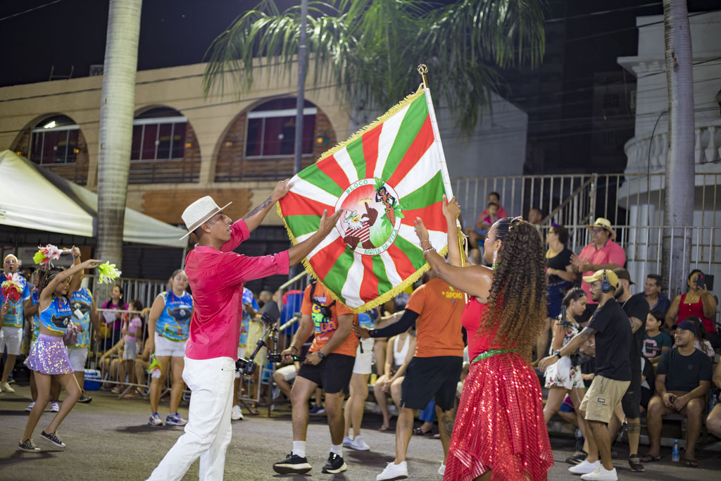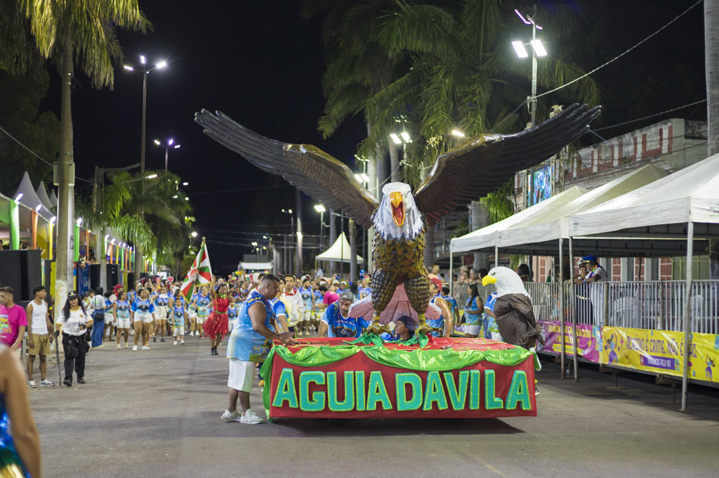Na sequência, o Bloco Águia da Vila apresentou o enredo “A Águia sobrevoa Corumbá, nossa maior paixão!”, exaltando as belezas naturais, o casario histórico, o Porto Geral e o pôr do sol pantaneiro. Com aproximadamente 950 integrantes, levou carro abre-alas imponente e alas vibrantes, em uma verdadeira declaração de amor à Cidade Branca.