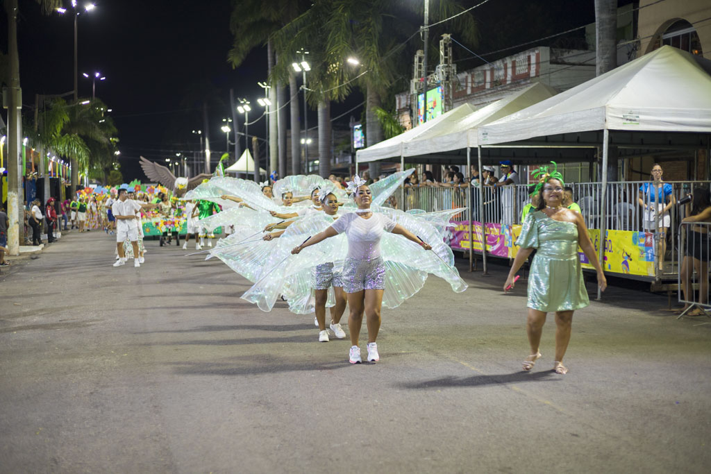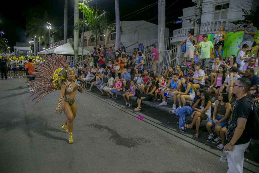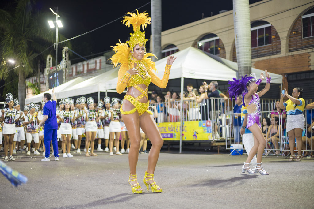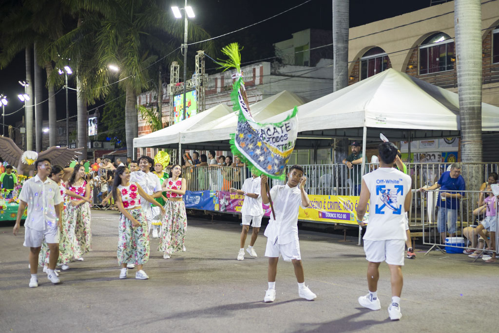 Abrindo a noite, o Bloco Afro Samba Reggae encantou o público com o enredo “O Rei Tuiuiú e a Princesa Vitória-Régia”, destacando a grandiosidade do Pantanal e a urgência de sua preservação. Com cerca de 600 componentes, o bloco transformou a avenida em um espetáculo de cores e sons, exaltando a fauna, a flora e o ciclo das águas, enquanto a bateria “Furiosa do Pantanal” conduziu o desfile em ritmo contagiante.