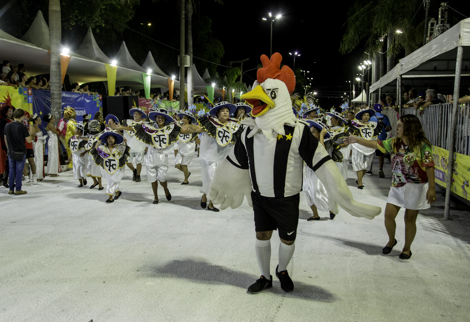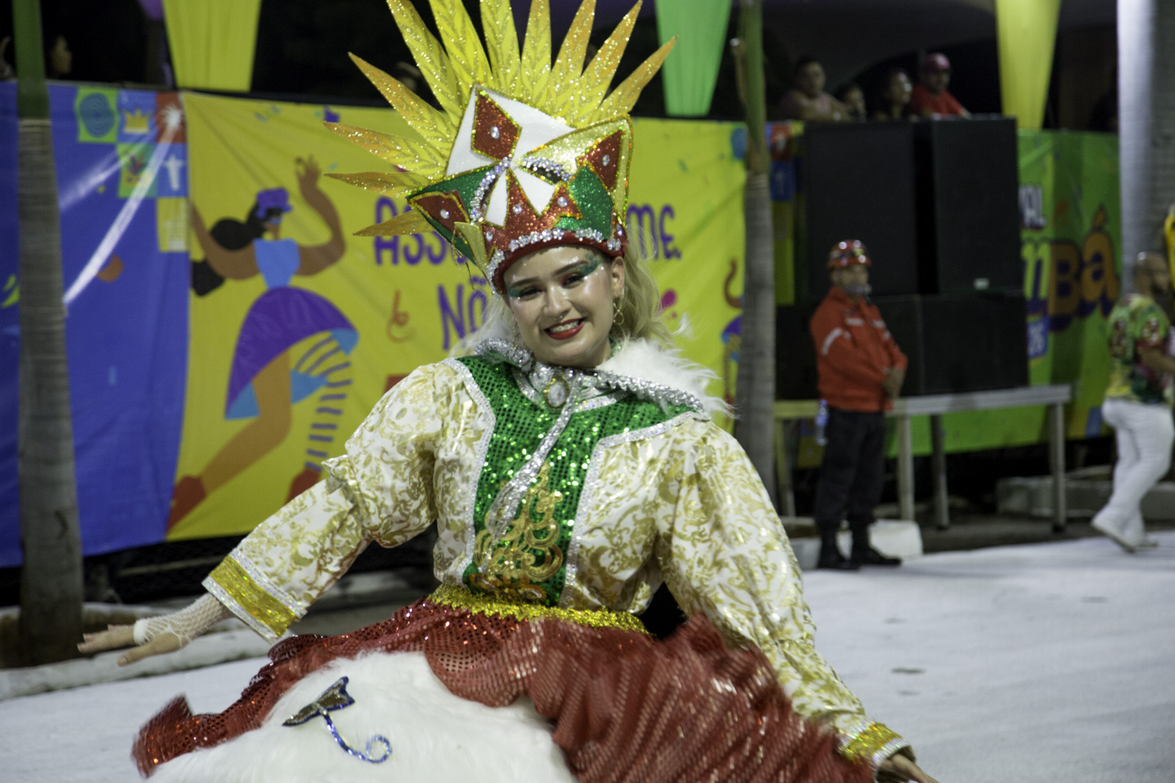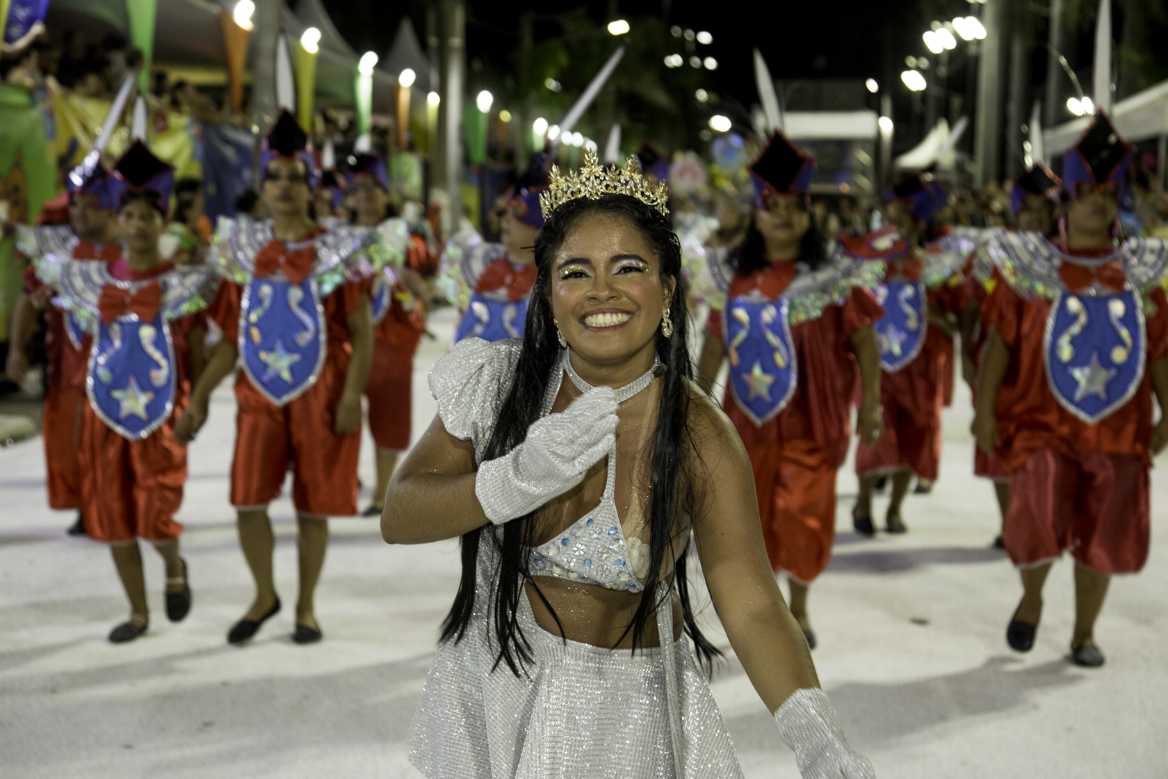 Fundada em 2007, a escola desfilou com cerca de 600 componentes, distribuídos em 16 alas, quatro alegorias, bateria, passistas e baianas. As cores branco, vermelho, amarelo e verde dominaram fantasias e carros alegóricos, simbolizando a identidade construída ao longo dos anos. A comissão de frente encenou a recepção do Rei Momo à jovem Imperatriz, marcando simbolicamente o início do baile que conduziu o público por uma viagem entre passado, presente e futuro.