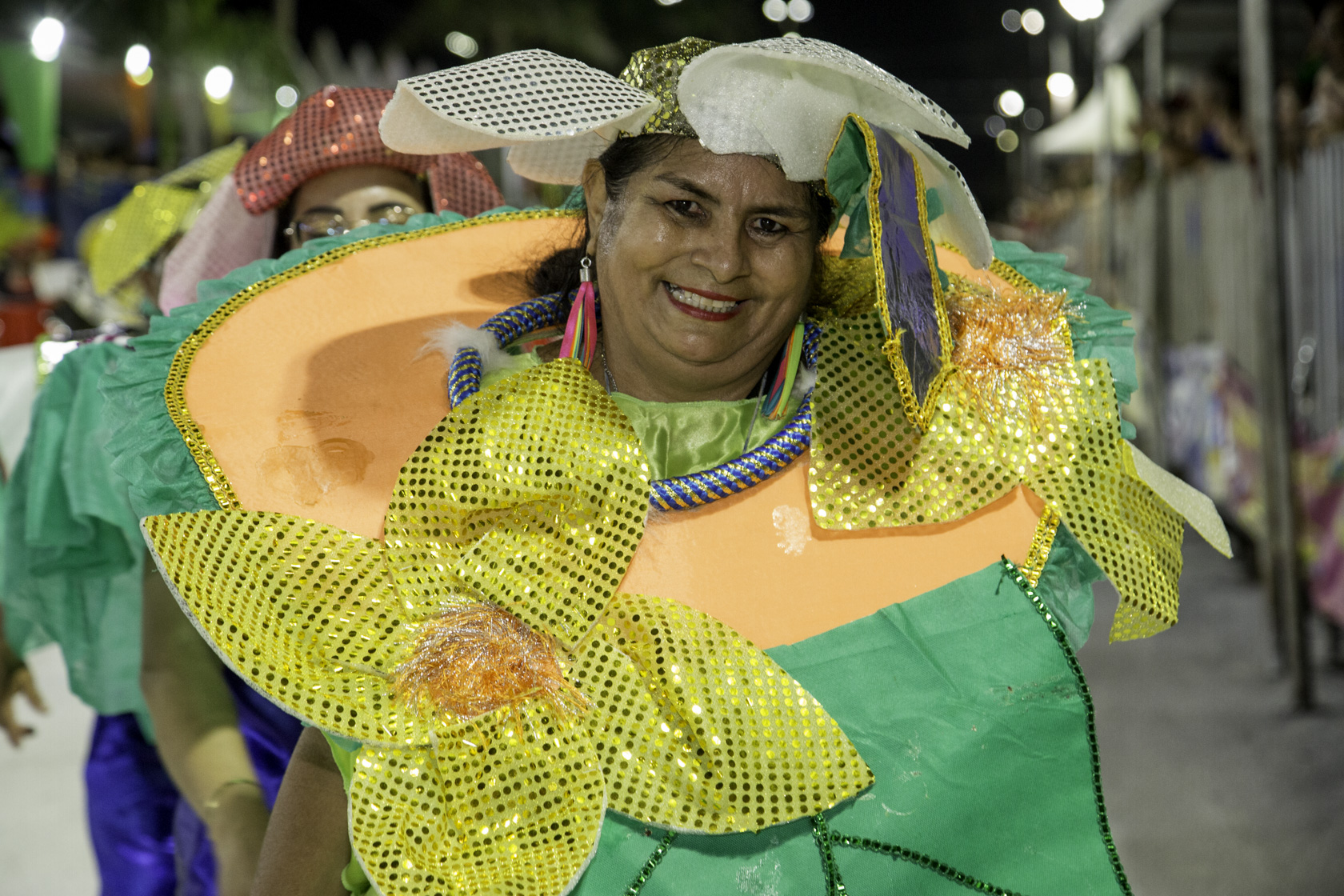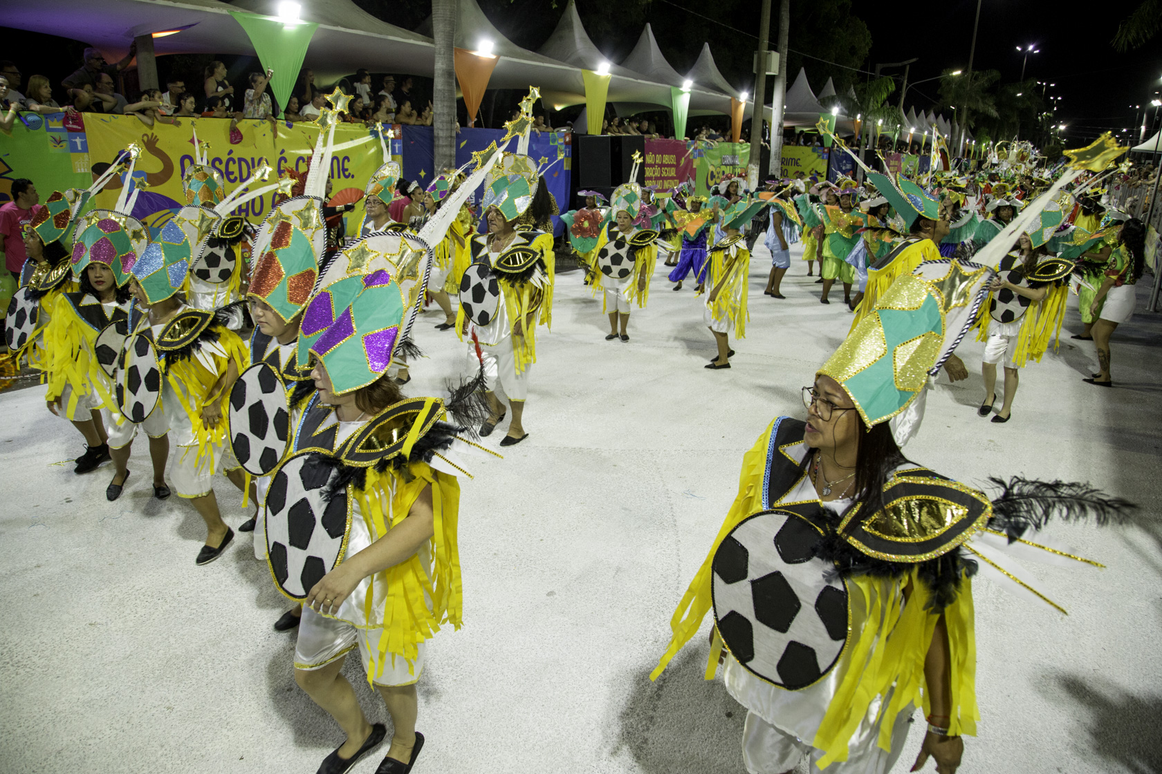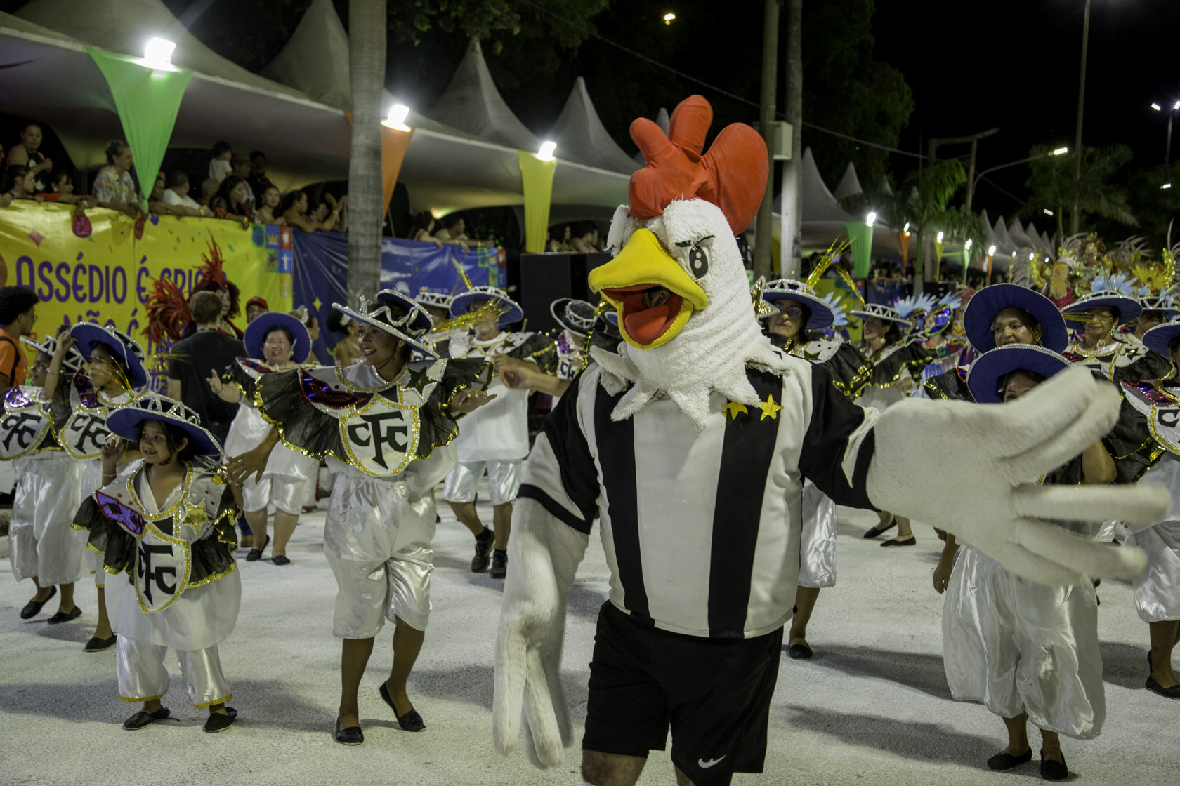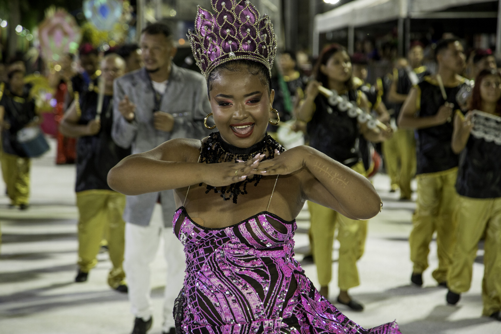 Fundada em 2007, a escola desfilou com cerca de 600 componentes, distribuídos em 16 alas, quatro alegorias, bateria, passistas e baianas. As cores branco, vermelho, amarelo e verde dominaram fantasias e carros alegóricos, simbolizando a identidade construída ao longo dos anos. A comissão de frente encenou a recepção do Rei Momo à jovem Imperatriz, marcando simbolicamente o início do baile que conduziu o público por uma viagem entre passado, presente e futuro.